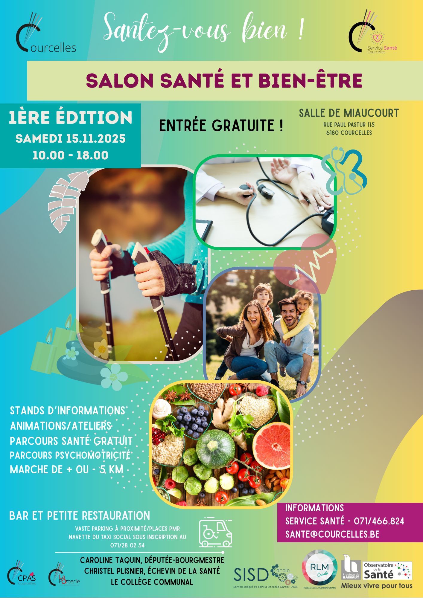 Le Rlm Charleroi et le Sisd Carolo Asbl organisent en collaboration avec l’Echevinat de la santé de Courcelles un Salon Santé & Bien-Être le samedi 15 novembre 2025 .